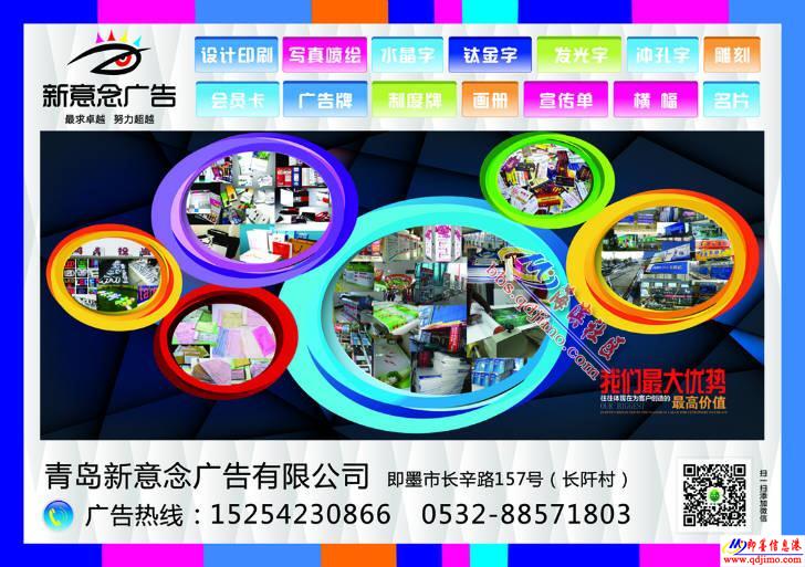 我公司是專業(yè)從事即墨設(shè)計(jì)印刷,即墨寫真噴繪,即墨會(huì)展,即墨桁架舞臺(tái)搭建,即墨門頭燈箱,即墨廣告牌制度牌,即墨發(fā)光字沖孔字,即墨展架易拉寶,即墨畫冊(cè)宣傳單等平面廣告的設(shè)計(jì)制作,已有十余年的制作經(jīng)驗(yàn),擁有國際最先進(jìn)的寫真機(jī)噴繪機(jī)雕刻機(jī)等廣告設(shè)備,歡迎廣大客戶前來淺談合作。